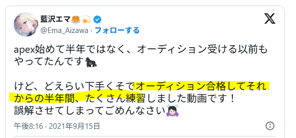 藍沢エマさんもオーディションを受ける以前からApexなどのゲームはプレイしていたようですが、「ゲームが下手くそ」と言っており、合格してから猛練習して実力をつけたようです!
