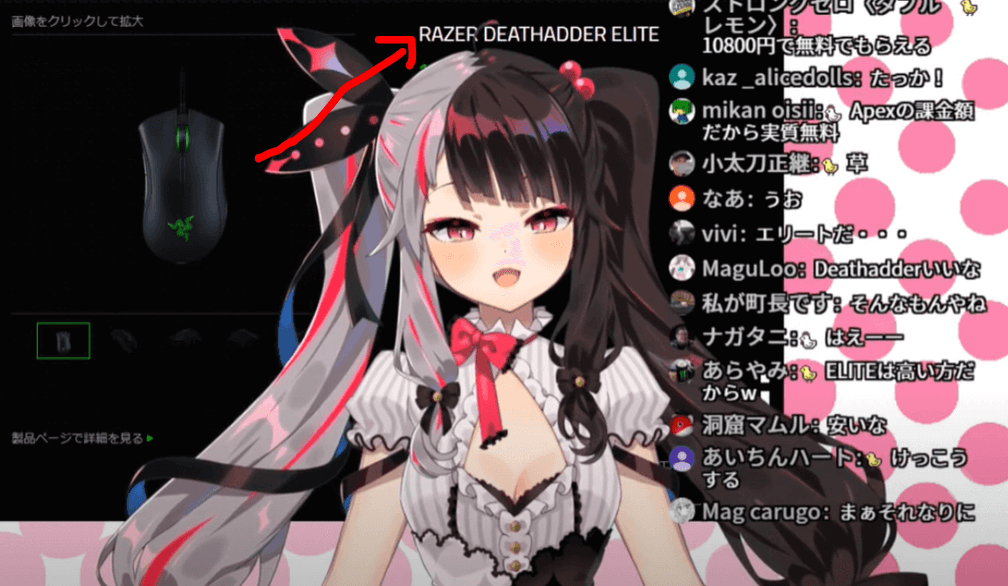 夜見れなさんが「愛用のマウスはRazer DeathAdder Elite」と配信中に話していました。