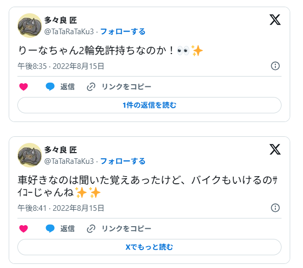 唯宵りーなさんも同じく車とバイクが好きでした。
